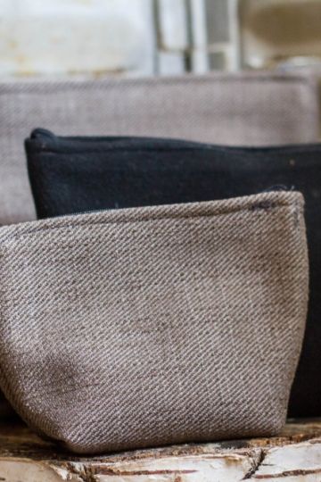 Ces pochettes sont toutes réalisées dans le même tissu, marron grisé tramé d'un côté, noir profond et tout doux de l'autre. Dans la plus grande et la plus petite, le noir est à l'intérieur. Il est à l'extérieur sur la taille intermédiaire !