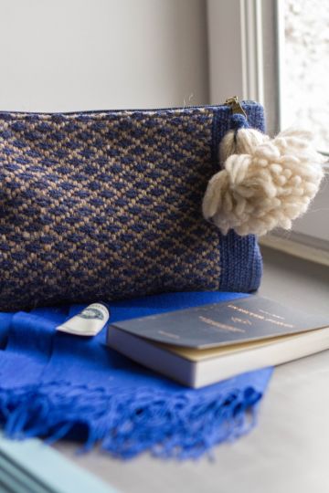 En laine, dans un design bleu et beige très graphique, avec leur gros pompon qui les rend très féminines, elles ont été dessinées par une créatrice talentueuse.