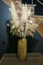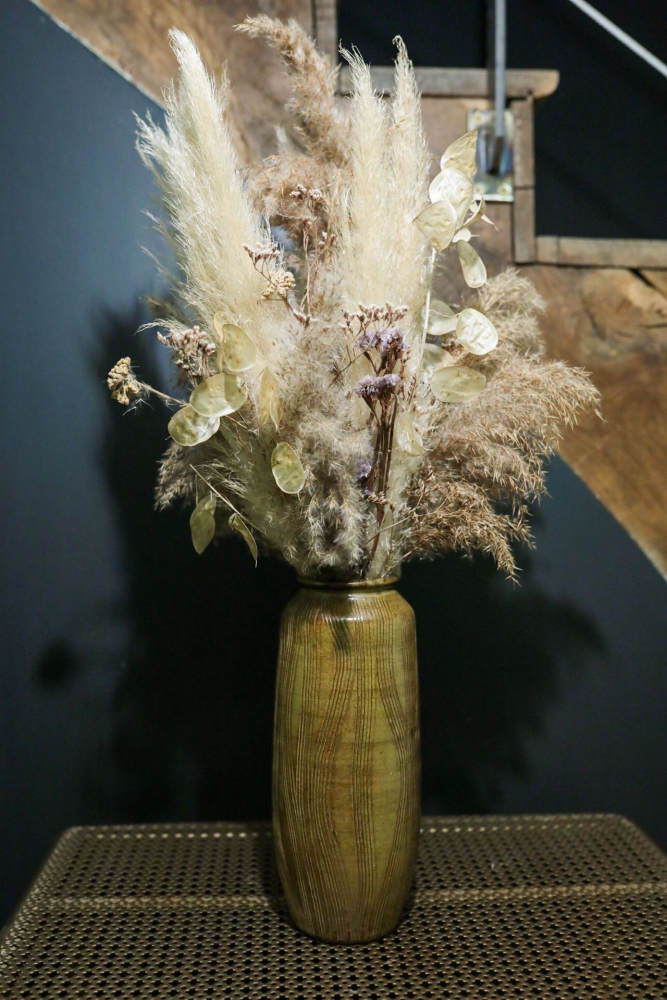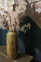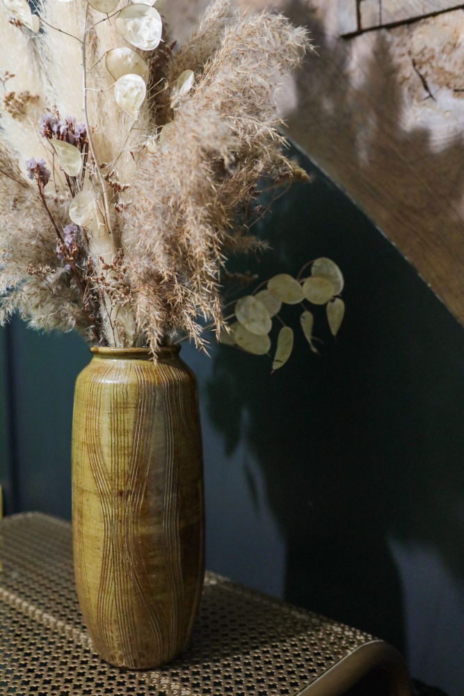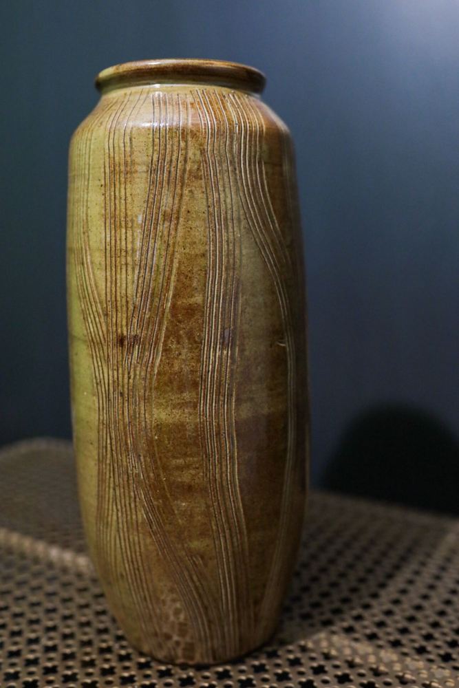 On a craqué pour ce vase à la forme élancée, aux belles teintes terre et ocre, aux stries graphiques.