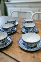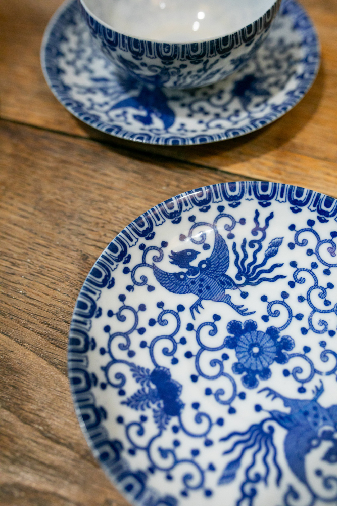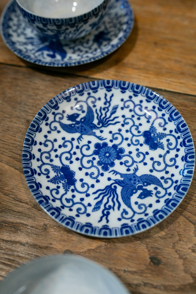 Composé de 6 tasses et sous-tasses en porcelaine extra-fine, cet ensemble très délicat a pour motif un phénix traditionnel - oiseau mythique, doté d'une immense longévité et caractérisé par son pouvoir de renaître - (ou “flying turkey”) entouré de végétaux stylisés dans des tons bleu cobalt et blanc.